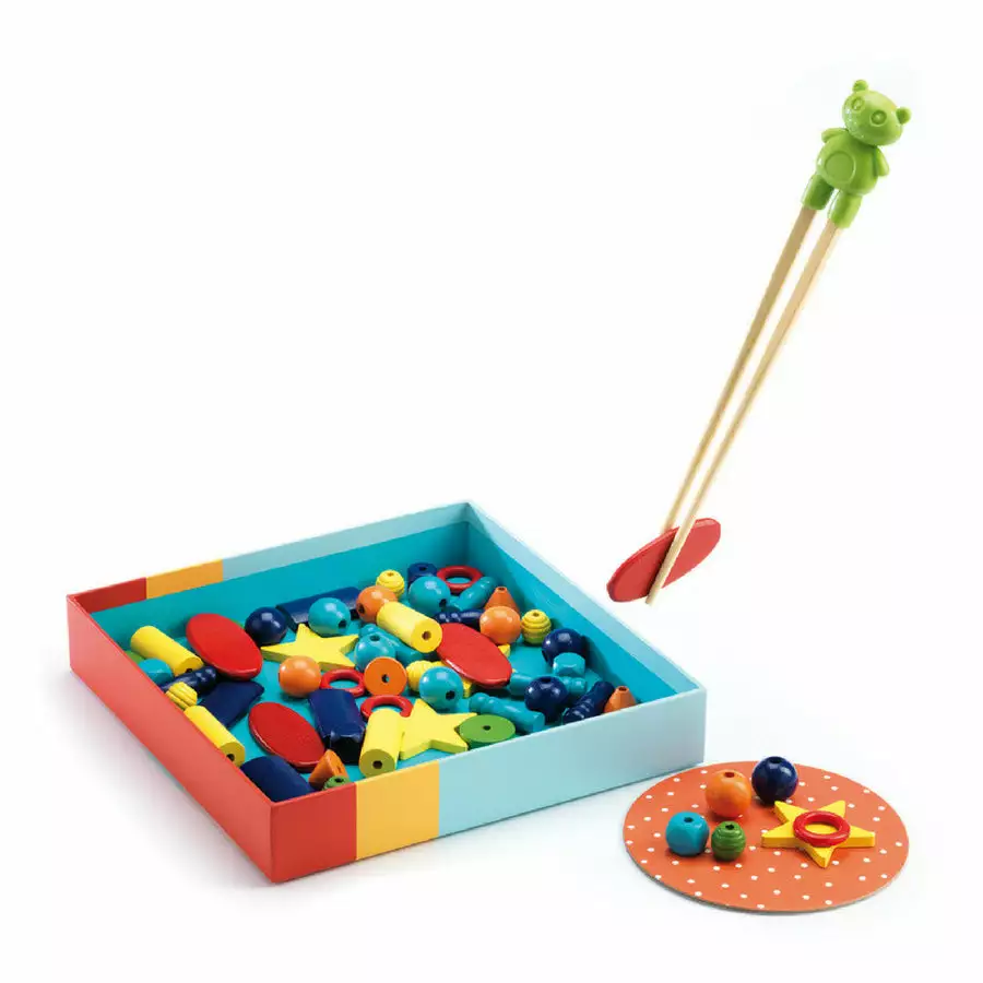 Sounds easy right? But there’s a catch! The players must use chopsticks to handle the beads and if the tower topples, back to the start they go. A game to develop dexterity.