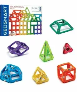 The GeoSmart Educational Set is a learning kit featuring 100 pieces and 6 different geomagnetic shapes of bight colours.